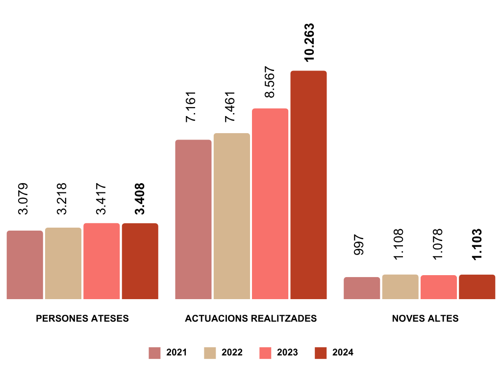 En termes quantitatius destaca una clara tendència a l'alça pel que fa a les actuacions executades pels professionals de SSB. En aquest sentit, s'han realitzat 1.0263 intervencions i s'han atès 3.408 persones, el què suposo un augment en prop del 20% pel que fa a intervencions i actuacions directes d'atenció individual i/o familiar.
